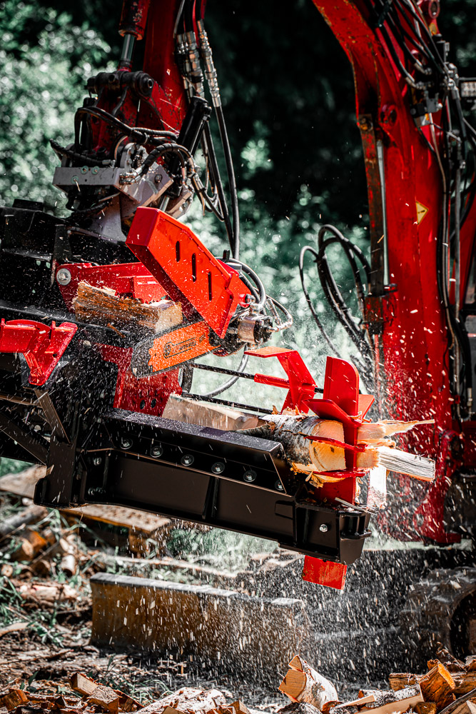 5. Halkaisu: Katkaistu puu putoaa halkaisukouruun, ja seuraavalla syöttöliikkeellä se halkaistaan hydraulisesti. Halkaisuterä on vaihdettavissa 2-, 4- tai 6-​osaiseksi versioksi.